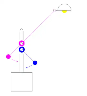 This construction uses a chain to keep the arm with the counterweight and the forearm parallel. The lamp-cap and counterweight move in opposite directions (both away from the base or both towards it). The balance that is required is shown by the following formula: