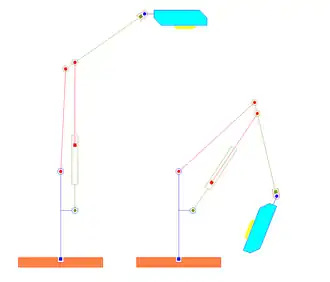 The short arms (green) stay parallel. One spring puts pull force on the blue arm. (If the blue arm is tilted back the second spring on this arm gets push force.) The blue arm controls the two parallel arms (red) that make up the upper arm. The other spring puts pull force on the other blue arm. This arm controls the forearm (magenta). The two springs can be the same size; one spring has to lift more weight but is more vertical. The other spring lifts less weight but is more horizontal.