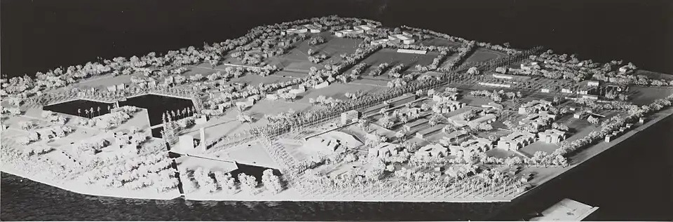 View looking southwest, with main academic buildings in the right foreground, of a model of the campus master plan by architect Paul Rudolph circa 1966