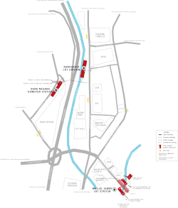 While not well-integrated, the Bank Negara station was initially designated in official transit maps as an interchange station with the Ampang and Sri Petaling lines' Bandaraya LRT station. This has since been redefined as connecting stations as Bank Negara and Bandaraya did not share an integrated paid-area. Changes between the stations require that one exit either stations and cross a footbridge that crosses Jalan Kuching and the Gombak River. The estimated walking distance between the stations is 140 m. The Ampang and Sri Petaling Lines station is situated nearby bus stops along Jalan Raja Laut, Jalan Dang Wangi and Jalan Tuanku Abdul Rahman.
