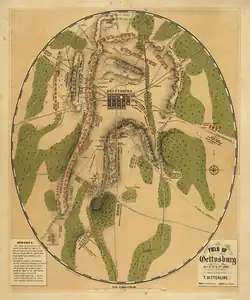 An 1863 oval-shaped map depicting the Gettysburg Battlefield during the three-day Battle of Gettysburg, showing troop and artillery positions and movements, relief hachures, drainage, roads, railroads, and houses with the names of Gettysburg residents at the time of the battle
