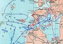 On 16 August, a second attempt was made to enter the gulf. The dreadnoughts SMS Nassau and Posen, four light cruisers, and 31 torpedo boats breached the defenses to the gulf.[3] On the first day of the assault, the German minesweeper T46 was sunk, as was the destroyer V99. On 17 August, Nassau and Posen engaged in an artillery duel with Slava, resulting in three hits on the Russian ship that prompted her withdrawal. After three days, the Russian minefields had been cleared, and the flotilla entered the gulf on 19 August, but reports of Allied submarines in the area prompted a German withdrawal from the gulf the following day.[4]