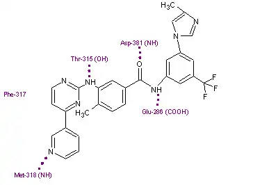 Imatinib binds to Abl domain via six hydrogen bond interactions. This stabilizes the imatinib Bcr-Abl complex and prevents ATP from reaching its binding site.[5][9][11] The hydrogen bonds involve the pyridine-N and backbone-NH of Met-318, the aminopyrimidine and side chain hydroxyl of Thr-315, the amide-NH and side chain carboxylate of Glu-286, the carbonyl and backbone-NH of Asp-381, the protonated methylpiperazine with the backbone-carbonyl atoms of Ile-360 and His-361. Additionally, a number of van der Waals interactions contribute to binding.[9] A hydrophobic pocket is formed by amino acid residues Ile-293, Leu-298, Leu-354 and Val-379 around the phenyl ring adjacent to the piperazinyl-methyl group of imatinib.[11] At the time of its discovery, in the absence of structural information, no clear explanation for the impressive selectivity of imatinib could be found.[7]