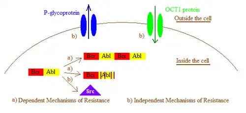 In general, imatinib resistance can be subdivided into Bcr-Abl dependent and independent mechanisms. Bcr-Abl dependent mechanisms include over expression or amplification of the Bcr-Abl gene and point mutations within the Bcr-Abl kinase domain that interfere with imatinib binding. Bcr-Abl independent mechanisms include factors influencing the concentration of imatinib within the cell, for example by alterations in drug influx and efflux and activation of Bcr-Abl independent pathways, such as members of the Src kinase family.[2] Imatinib resistance can also be produced by other mechanisms that will not be mentioned here as the importance of those mechanisms still remain a question due to lack of clinical data.