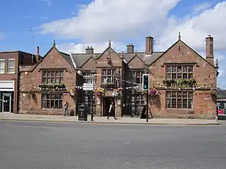 According to the date on the lintel over the front door, the Bear's Paw was constructed in 1632. It was built on land owned by the Savages of Rocksavage, who were lords of the manor. The original name was the 'Lyon's Paw', this being based on an animal's paw on the arms of the Savage family. In 1697 Earl Rivers of the Savage family reverted to Roman Catholicism and, following the outcry resulting from this, the name was changed to the 'Bear's Paw'.[2] In the 18th century its title was the 'Bears Paw Hotel and Posting House'; Royal Mail coaches called there when travelling between Chester, Warrington and Manchester. When the Lancashire, Cheshire and Birkenhead Railway opened in 1850, Frodsham station was near the hotel and 'Railway Hotel' was added to its title. In 1903–04 the front and side of the building were restored by the Chester firm of architects Douglas and Minshull.[2]