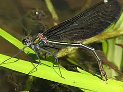 Beautiful demoiselles live mainly near small to medium-sized streams and creeks.[7] They prefer a relatively low water temperature and a moderate to fast flow. The water must not be nutrient-rich (eutrophic). In the northern part of their range, such as in Norway and Finland, they are also found near medium-sized rivers or even larger streams. The waters are usually in the immediate vicinity of forests.