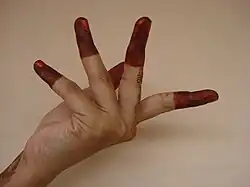 Lastly, all dancers outline their hands and feet with red kumkum powder or alta, a tradition that helps the audience easily see their hand and foot gestures.[102]