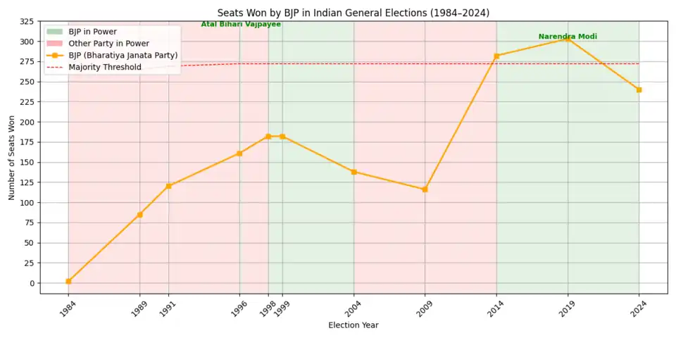 The party's origins lie in the Bharatiya Jana Sangh, which was founded in 1951 by Indian politician Syama Prasad Mookerjee, after he left Hindu Mahasabha to form a party as the political wing of RSS.[49][50] After the Emergency of 1975–1977, the Jana Sangh merged with several other political parties to form the Janata Party; it defeated the then-incumbent Indian National Congress in the 1977 general election. After three years in power, the Janata Party dissolved in 1980, with the members of the erstwhile Jana Sangh reconvening to form the modern-day BJP. Although initially unsuccessful—winning only two seats in the 1984 general election, it grew in strength on the back of the movement around Ram Janmabhoomi in Uttar Pradesh. Following victories in several state elections and better performances in national elections, the BJP became the largest political party in the Parliament in 1996; however, it lacked a majority in the lower house of Parliament, and its government, under its then-leader Atal Bihari Vajpayee, lasted for only 13 days.[51]