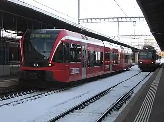 Now every hour a RegioExpress services takes 40 minutes and a Regio service takes 57 minutes to run from Biel/Bienne to La Chaux-de-Fonds and in the opposite direction.[2] The Regio is split or joined in Sonceboz-Sombeval, with one part running to La Chaux-de-Fonds and the other to Solothurn via Moutier. The SBB took over 13 GTW sets from the BLS for the service in 2014.[3]