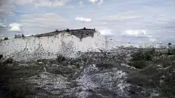 Surveying work was done in 1938–1938 to determine if there were useful mineral reserves in the area.[10] Eventually, chalk deposits were discovered near Bilohorivka in 1946. The mining of that resource would become the basis of the village's economy, and construction of processing plants began.[8] Starting in 1952, mining began, and the deposits became the main source of raw materials for the Lysychansk Soda Plant. In 1954, a cable car track was set up to connect the quarry and the soda plant, at a length of 16.5 kilometres (10.3 mi).[10] Bilohorivka received urban-type settlement status in 1958.[8][6]