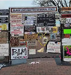 The Black Lives Matter Memorial Fence (BLM Memorial Fence) was a two-block eight-month long protest art installation of Black Lives Matter memorials attached by visitors and community activists to the chain link fence outside the White House on H Street, between Vermont Avenue and Connecticut Avenue NW in Downtown Washington, D.C. in 2020 and 2021. The 1.7-mile (2.7 km) cordon of fencing around the White House was erected to move the growing crowds of protesters gathered at and around Lafayette Park after the murder of George Floyd on May 25, 2020.[1] The Memorial Fence developed from June 2020 until it was dismantled and archived in January 2021. Members of the public worked together to maintain, protect, and then archive the thousands of signs and artworks that were offered by the public.
