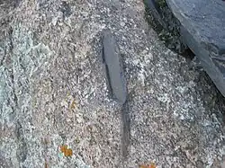 Phyllite embayed in granite along contact. The phyllite piece is ~20 cm.