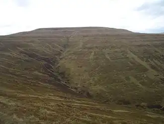 In his description of a Blak Montayne, the antiquarian John Leland refers to a massif extending between Carmarthen and Monmouth i.e. what is now considered to be the Brecon Beacons in the wider modern sense of that term, thus including the Black Mountain far to the west and the intervening high ground. There is a suggestion too that the names Hatterrall Hill and Mynydd y Gader may also once have been used to apply to the entire range of the Black Mountains though the former later became confined to the vicinity of its eastern ridge. The latter is now recognised in Pen y Gader-fawr (Pen y Gadair Fawr) and Gader Fawr (Gadair Fawr); names applied to the hill at SO 229288. Cadair, mutated to 'gadair' and anglicised as 'gader', means 'seat' or 'chair' in Welsh.[1][2] The Welsh name for these hills is traditionally Y Mynydd Du ('the black mountain') though in more recent times the name Y Mynyddoedd Duon ('the black mountains') has been used, being a retranslation from the English.[3]