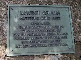 Plaque at the summit of Mount Craig honoring the mountain's namesake, Governor Locke Craig
