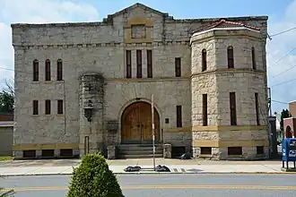 Blairsville Armory is a historic National Guard armory located at Blairsville, Indiana County, Pennsylvania. It was designed by Pittsburgh architects W.G. Wilkins & Co. It was built in 1909, and is a T-shaped, two-story, three-bay-wide and nine-bay-deep, castle-like building in the Romanesque Revival style. The front section is the flat-roofed administration building, with a gable roofed drill hall behind. Its front facade features a central arched entrance with a five-sided, two-story bay window on the right side.[2]