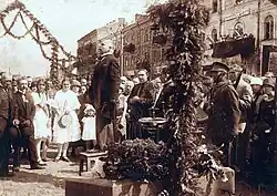 On 15 October 1919, he was elected by the Białystok City Council as the mayor following the first local election to the city council that took place on September 7 that year, in which he ran on Polish Electoral Committee (Polish: Polski Komitet Wyborczy) ticket. He held this position for two terms until 1927.[3] He was valued positively as being energetic person, having extensive knowledge of the economy and administration.[2] As the front of the Polish–Soviet War was approaching to the city, on 13 June 1920, the Citizens' Committee for National Defence (Polish: Obywatelski Komitet Obrony Narodowej) was established. Its presidium included Karol Tołłoczko, Władysław Kolendo, Kazimierz Riegert and Szymański himself. Additionally, he was given the authority to create a volunteer army by order of General Józef Haller. The last meeting of the Committee in Białystok took place on 27 July, a few hours before the Bolsheviks occupied the city. The next one took place in Wysokie Mazowieckie, from where the Committee left for Warsaw. On 18 September 1920 Szymański returned to the city.[2]