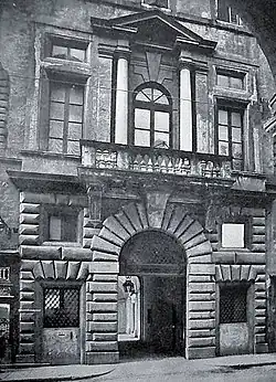 Between the west side of piazza Scossacavalli and the south side of Borgo Nuovo, the Caprini family from Viterbo let erect by Bramante their Roman residence.[15] The palace was then bought by Raphael, who completed it and spent there the last 3 years of his life, dying there in 1520.[46] Later, the building was enlarged, becoming the Palazzo dei Convertendi. Along Borgo Nuovo the palace had a monumental portal surmounted by a balcony, both designed by Baldassarre Peruzzi; the latter was considered the most beautiful in the whole city.[47][48] The Palazzo dei Convertendi was demolished in 1937 and rebuilt in 1941 west of Palazzo Torlonia with another plan but reusing original elements, included the portal with the balcony.[49]