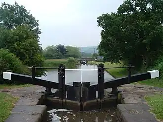 The locks are unusual for narrow canals, in that they are fitted with mitre gates at both top and bottom, as opposed to the more usual clapper top gate.[14] The chambers are constructed from large blocks of stone, with mason's marks visible on many of them. The locks were equipped with side ponds to save water, but these were taken out of use many years ago, although they still function as overflow channels. The frames for the paddle gear are still visible at four of them.[15]
