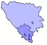 Map of modern Bosnia and Herzegovina. 1. Sarajevo, 2. Stolac, 3. Gacko, 4. Trebinje. Herzegovina is shaded darker.