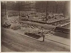 A cornerstone-laying ceremony for the new library was hosted on November 28, 1888,[63][91][93] after a two-month postponement.[94][c] Shortly afterward, McKim closed his Boston office and moved back to New York.[74] The state legislature passed a bill in March 1889, allowing the city to borrow $1 million for the library.[VI][78][96] Meanwhile, the plans were changed slightly, and 70 stonecutters were working on the building by April;[97] some of the stonework had reached the top of the ground story by that May.[98] Several firms submitted bids for the general construction contract,[99] which was awarded to Woodbury & Leighton.[100] Contracts were awarded for other aspects of construction over the next two years,[100] and by the end of 1889, the foundations had been completed.[63] The stonework on the Dartmouth Street facade had reached the cornice by mid-1890,[101] and a worker was killed that October after falling from an arch.[102] Workers created a test section of cornice so McKim could examine its details,[103] and Abbott and McKim traveled to Europe to scrutinize the marble used in the building.[104]
