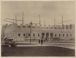 The basic plans for the library were completed by mid-1887.[13] That October, the Board of Aldermen unsuccessfully attempted to divert $75,000[IV] allocated for the library to sewage pipes;[70] the plans were nearly complete by then.[71] The BPL approved preliminary plans on November 3, 1887,[13] and McKim continued to refine the design over the following months.[72] McKim considered going to Paris to ask his friend Honoré Daumet for inspiration, but McKim's partner William Rutherford Mead advised against it, telling him that "nobody but yourself can take care of the Library for the next three months".[68][72] Instead, McKim had a young draftsman, William T. Partridge, assist him in refining the design.[72][73] After the plans were finished, McKim presented it to the trustees,[74] who approved McKim's revised plans on March 30, 1888.[63][75] One trustee opposed to the plans, William Henry Whitmore,[76][77] later resigned in protest.[74][78] The approved plans were displayed in the State House,[63][75] and the BPL's trustees issued reproductions of McKim's drawings.[69]