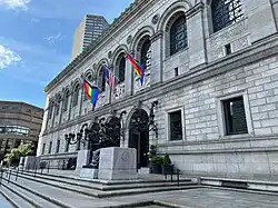 The Boston Central Library is on Copley Square in the Back Bay neighborhood of Boston, Massachusetts, United States.[2] It occupies a full city block bounded by Boylston Street to the north, Dartmouth Street to the east, Blagden Street (originally St. James Avenue[3][4]) to the south, and Exeter Street to the west.[5] The original library, designed by Charles Follen McKim, is on the eastern half of the block. The western half is occupied by an annex designed by Philip Johnson.[6] The two sections of the building are about 2.5 inches (64 mm) apart.[7]