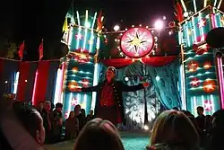 Samuel addressing the audience gathered in Central Park as he prepares to use his powers to bury the crowd.