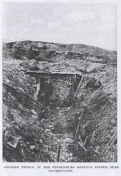 On 27 September 1918 it attacked and advanced Havrincourt Wood through the Siegfriedstellung (Hindenburg Line) via objectives called the Black, Red, Brown, Yellow and Blue lines, to Welsh Ridge.[60] The Hindenburg Line was attacked in enfilade, or diagonally, as can be seen from the map. Many casualties were sustained from machine guns situated in Beaucamps to the right of the division's front during the Battle of the Canal du Nord. Its infantry relieved by New Zealand Division and withdrew to Havrincourt Wood for rest on 29 September 2018. The divisional artillery remained in action in support of the New Zealand Division in the Pursuit to the Selle.[61]