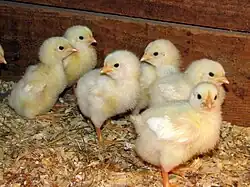 On hatch day (day 21), the trays are removed ("pulled") from the hatchers, and then the chicks are removed from the trays. Chicks are inspected, with the sickly ones being disposed of. Chicks may be by vaccinated, sorted by sex, counted, and placed in chick boxes.[27][28] Stacks of chick boxes are loaded into trucks for transport, and arrive at the broiler farm on the same day. Specialized climate-controlled trucks are typically used, depending on climate and transport distance.[29]