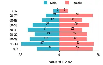 According to the 2002 Poland census, there were 436 people residing in Budziska village, of whom 47% were male and 53% were female. In the village, the population was spread out, with 24.5% under the age of 18, 35.1% from 18 to 44, 18.8% from 45 to 64, and 21.6% who were 65 years of age or older.[1]