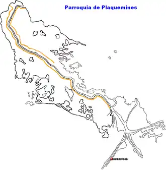 Location of Burrwood within Plaquemines Parish, Louisiana.