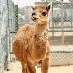 A cama is a hybrid between a male dromedary camel and a female llama, and has been produced via artificial insemination at the Camel Reproduction Centre in Dubai.[1] The first cama was born on January 14, 1998. The aim was to create an animal capable of higher wool production than the llama, with the size and strength of a camel and a cooperative temperament.[2]