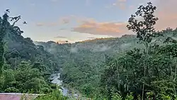 Hikers can begin the route[5] of El Camino de Costa Rica from either the island village of Barra de Parismina[6] or islands in the municipality of Barra de Pacuare. The coast can be accessed during the day from these locations. A short boat ride along canals leading from the Atlantic Ocean delivers hikers to the dock at Goshen, from which the trail continues on the mainland. The route crosses the Nairi-Awari Indigenous Territory, traverses the Pacuare River, enters the valley of Angostura Lagoon, follows a rural road along the edge of Tapantí National Park, descends into the Orosi Valley, and climbs up to its highest altitude of 7,154 feet (2,181 m) in the community of El Empalme. From there the trail weaves through the coffee fields of Tarrazú and the Los Santos Zone down to the city of Quepos on the Pacific coast. The northern volcanoes Turrialba and Irazú can be seen from afar over long stretches of the trail.