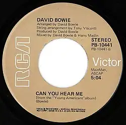 "Can You Hear Me?" is a ballad by the English musician David Bowie from his 1975 album Young Americans.[1] Bowie called it a "real love song", written with someone in mind, but he did not identify them.[2] The song was released as a single in November 1975 on the B side of "Golden Years".