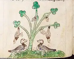 29. ^ The "un-named" island is a mystery. It is possible that Boece was thinking of Islay. In some versions of Boece's Historia..., The barnacle geese (claik geese) story appears in a section which also recalls Boece's beliefs on the mythical island of Thule. According to Anicius Manlius Severinus Boëthius (Boethius) a 6th-century philosopher, Thule or Tile refers to the western edge of the known world.