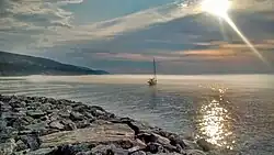 Sunset on the St. Lawrence River, in front of Cap-à-l'Aigle[8] and the marina, protected by a high pier of large stones, are located in front of the village, near a strike. Sailors frequent the marina all summer because it is well located between Tadoussac and Baie-Saint-Paul. Annually, during the Labor Day weekend, the Cap-à-l'Aigle Marina closes the sailing season in Quebec with a major nautical event. Every weekend before Labor Day, sailing events are held in Quebec including the Triangle Race, the Crescent-Price Cup and the Edmond Desgagnés Challenge.