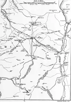 If they could quickly capture the Esdraelon Plain while the two Ottoman armies were fighting in the Judean Hills against the XXI Corps infantry in the Battle of Sharon, and the XX Corps infantry in the Battle of Nablus, the railways could be cut, the roads controlled, and the lines of retreat across the plain for these two Ottoman armies west of the Jordan would be virtually cut.[17] Success depended on the rapid capture of the communications hub at Afula and the Yildirim Army Group's general headquarters at Nazareth which would disrupt communication and simultaneously almost surround the Eighth Army and cut the communications and supply lines to both the Seventh and Eighth Armies in the Judean Hills. (See Falls Map 21 below which shows these cavalry advances.)[5][10][21] Success required that the cavalry not only capture but hold Afula, Nazareth, and the Esdraelon Plain for some time. The men and horses of three cavalry divisions would be dependent on rations being quickly and efficiently transported forward many miles from their base.[17]