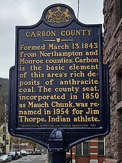The county seat is Jim Thorpe,[3] which was founded in 1818 as Mauch Chunk. The Lehigh River, a 109-mile-long (175 km) tributary of the Delaware River, flows through Carbon County.