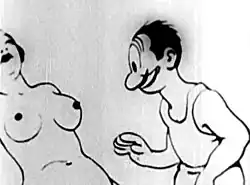 One of the earliest examples of erotic animation is The Virgin with the Hot Pants, a stag film that opens with an animated sequence featuring an independent penis and testicles pursuing a naked woman and having sex with her, then another sequence of a mouse sexually penetrating a cat.[3] Another early example is Eveready Harton in Buried Treasure, a 6.5-minute silent black-and-white animated film produced in 1928 by three US animation studios, allegedly for a private party in honor of Winsor McCay. It features a man with a large, perpetually erect penis who has various misadventures with other characters and farm animals, plus his penis detaching and doing things on its own.[4] In 1932, Hakusan Kimura (木村白山)completed Japan's first erotic animation Suzumi bune using touches of Ukiyo-e style.[5]