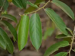 The leaves are simple and alternate. The shape can vary from lanceolate, ovate, and elliptical. The leaves mostly have an obtuse shape, with some being oblique. Many lateral veins are present on the leaf, surrounding the midrib.[6] The leaves range from a light green colour to a darker vibrant green.[7] The size of the leaves and range from 5 cm to 12 cm long.