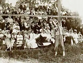 The production was filmed in approximately three weeks, between the final days of April 1916 and May 20.[12] The scenes of the three baseball games portrayed in the film were shot outside the city of Los Angeles, at the nearby community of Lankershim, which in 1927 would be renamed North Hollywood.[13] Director Ingraham hired a "former professional baseball player" to rehearse the cast there in batting and fielding and to assist in directing the actual filming of gameplay.[14] In newspaper interviews about the production, DeWolf Hopper described the baseball location's setup: "We rented a little ball park out in Lankershim and the local folks turned out in force to fill the grandstand and bleachers."[15] According to him, "The teams were made up partly from Lankershim players, partly from Fine Arts players, and they were good teams."[15]