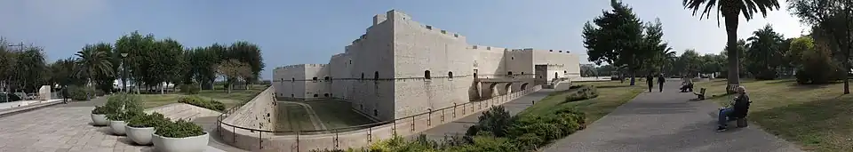 The castle of Barletta is the architectural result of various stratifications due to the succession of different ruling dynasties from the 11th century to the 18th century. Once a fortress for defensive purposes, surrounded by the sea that occupied the moat all around the castle and insulated it from potential enemy attacks, it constitutes a strategic point in city life as well as an important urban core.[1][2][3] It is home to the Municipal Library,[4] the Civic Museum and a conference and exhibition hall.[5]