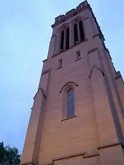 St. Mark’s Church was founded in 1858 as a mission of Gethsemane in downtown Minneapolis.[1] It was first located in North Minneapolis at Washington Avenue and 27th Avenue North.[1] In 1863 the original building was moved to the city center (4th Street and Hennepin Avenue) on a sled pulled by oxen.[2] It was incorporated as a parish on June 19, 1868,[3] and occupied a new building on 6th Street between Hennepin and Nicollet Avenues from 1870 to 1908.[4] Today's St. Mark's, designed by architect Edwin Hawley Hewitt (who was a parishioner), was built in 1910 on Hennepin Avenue overlooking Loring Park. The cornerstone was laid on November 15, 1908, and the Parish House was built first, with enough space to serve for worship while the actual church structure was being erected next to it.[5] By the late 1930s, Bishop Samuel Cook Edsall had moved his residence to Minneapolis from the Cathedral of Our Merciful Saviour in Faribault, and had begun referring to St. Mark's as a "Pro-Cathedral".[6] St. Mark's was officially designated the diocesan cathedral in 1941; the Cathedral of Our Merciful Saviour retained its cathedral status as "the historic cathedral".[7]
