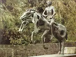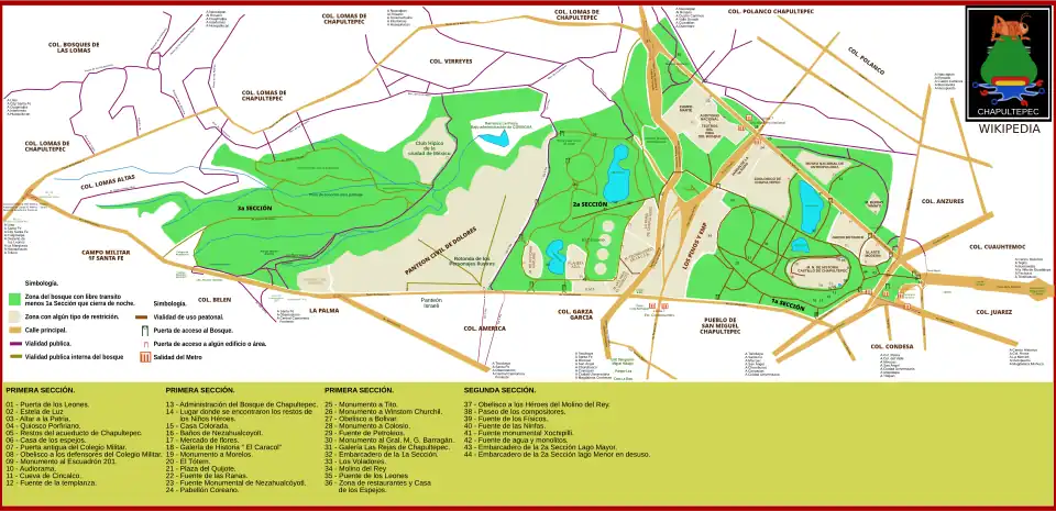 The oldest and most visited portion of the park is called the "first section".[3] It is the most developed area, and it has a wrought iron fence and gates that extend around its perimeter.[3][5] These fences mostly separate it from the streets that form its boundaries: Avenida Constituyentes (es), Paseo de la Reforma, Calzada Chivatito, and the Anillo Periférico. The interior measures 274.03 hectares (677.1 acres), with 182 hectares (450 acres) of this being undeveloped green space.[22] It contains most of the best known of the park's attractions, such as the Lago Menor (Small Lake), the Nezahuacoyotl Fountain, the Fuente de las Ranas, the Quixote Fountain, the Templanza Fountain, the Altar a la Patria, the Obelisco a los Niños Héroes, the Monumento a las Águilas Caídas (Monument to Fallen Eagles), The Ahuehuete, and the Baths of Moctezuma. The best-known museums in the park are in this section, including Museo Nacional de Historia-Chapultepec Castle, the Casa del Lago, the National Auditorium, the Centro Cultural del Bosque (es), the National Museum of Anthropology, the Rufino Tamayo Museum, and the Museo de Arte Moderno (Modern Art Museum). It also contains the Chapultepec Zoo, the Jardín de la Tercera Edad, and the Audiorama.[22] These are connected by various paved paths, many of which have names such as the Avenue of the Poets, which is lined with bronze busts of famous literary figures.[16] The pathway also has trees that are hundreds of years old.[22]