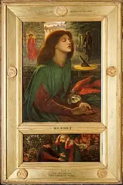 Beata Beatrix - Dante Gabriel Rossetti - Artist's rendition of his original painting but adding a predella depicting the artist and his wife (the model of the painting in the upper panel) meeting in paradise, with a frame designed by Rossetti. Hutchinson had acquired the painting in London for his private collection in 1883 and paid £ 1,200 for it[91] (about $97,000 in 2015).