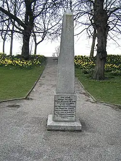 Since Gascoigne, or Bernardo Guasconi, was from Florence, he was reprieved by Parliament, which was wary of antagonising a foreign power, but Lucas and Lisle were executed by firing squad on 28 August 1648 in the castle yard at Colchester, and interred in the Lucas family vault within St Giles's Church.[1] Twelve years later, on 7 June 1661, the two men were reburied in an elaborate ceremony, and a stone placed by John Lucas, 1st Baron Lucas on their tombs. The inscription stated they were "by the command of Sir Thomas Fairfax in cold blood barbarously murdered", although in reality Fairfax had acted legally and in accordance with the terms of the capitulation.[2]