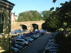 This 2007 photo, facing east and showing the Chatham Tunnel and Maidstone Road bridge, clearly illustrates the effect of the Kent Coast Electrification Scheme. Loop platforms existed either side of the mainline platforms, with the London bound loop being situated in the foreground where one of the car parks is currently.