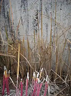 The Northern and Southern dynasties book Jingchu Suishiji describes the practice of firing bamboo in the early morning of New Year's Day,[35] a New Year's tradition of the ancient Chinese. Poet and chancellor of the Tang dynasty, Lai Gu, also described this tradition in his poem Early Spring (早春): "新曆才將半紙開,小亭猶聚爆竿灰", meaning "Another new year just started as a half-opening paper, and the family gathered around the dust of exploded bamboo poles."[36] The practice was used by ancient Chinese people to scare away evil spirits, since bamboo would noisily crack and explode from firing.