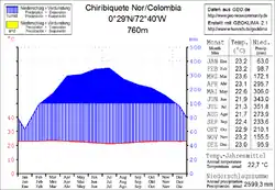 Chiribiquete National Natural Park has a tropical climate and gets about 4,500 mm of precipitation per year. The park has high levels of cloud cover due to the geographic orientation of the Serranía de Chiribiquete mountains. Rainfall is lowest between December and February, and highest between April and July. The annual average temperature is 24 °C (75 °F) with strong fluctuations between day and night. During the dry months, temperatures can rise to 32 °C (90 °F) during the day, and fall to 20 °C (68 °F) at night. The temperature difference between the lower and higher altitudes of the park is also very high. Temperatures can reach 35 °C (95 °F) in the lower altitudes and drop to 2 °C (36 °F) in the higher altitudes. The average humidity is 40% at daytime and rises to 100% at nighttime.[11][14][15]