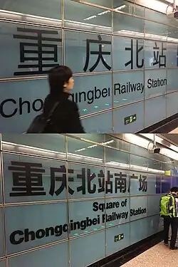 Chongqing North Station South Square[1] (simplified Chinese: 重庆北站南广场; traditional Chinese: 重慶北站南廣場; pinyin: Chóngqìng Běizhàn Nánguǎngchǎng), previously known simply as Chongqingbei Railway Station, is an interchange station on Line 3 (straddle beam monorail), Line 10 (heavy rail subway) and the Loop line (heavy rail subway) of Chongqing Rail Transit.
